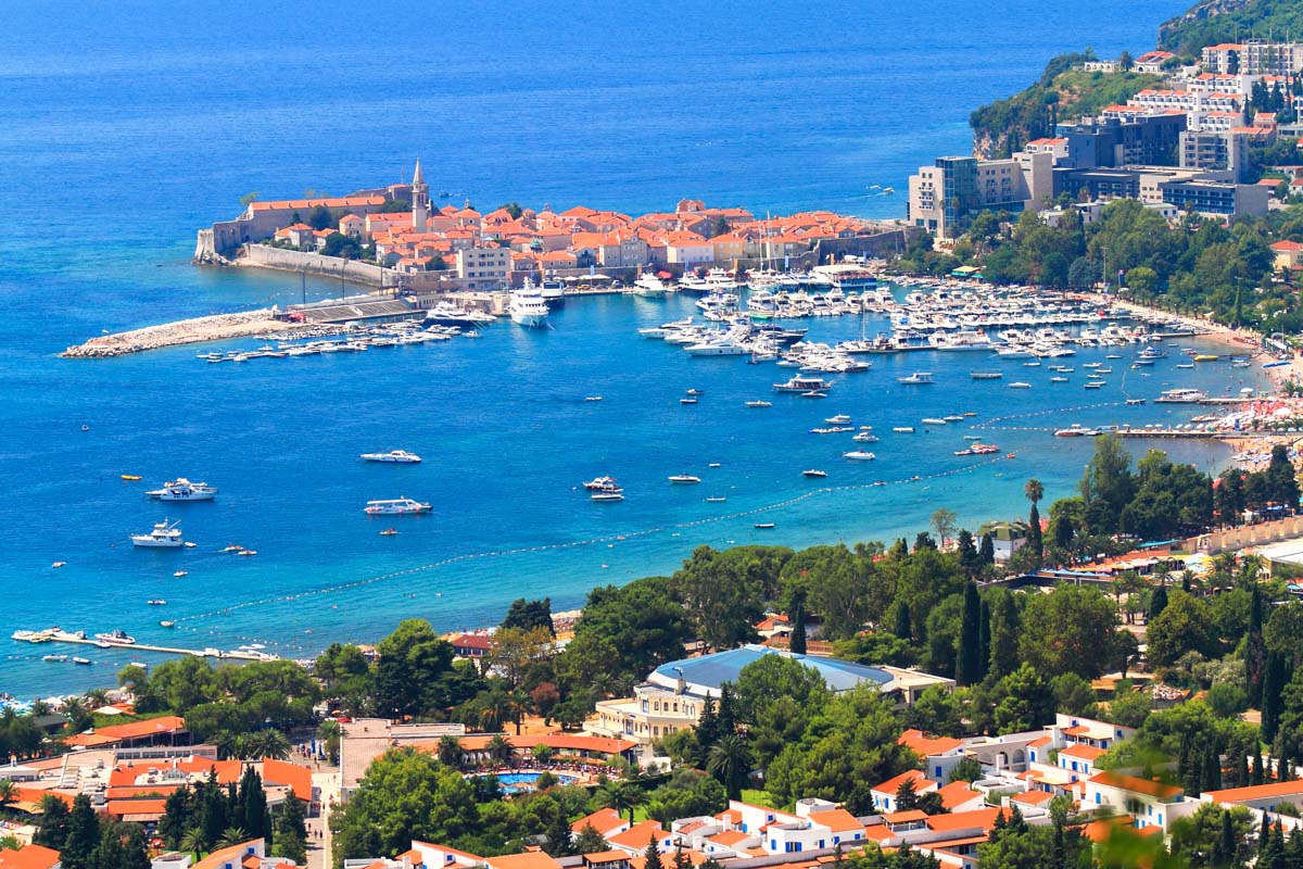 Die malerische Stadt Budva an der Adriaküste im Süden Montenegros zeigt sich bereits bei der Anfahrt über die Passstraße von ihrer schönsten Seite