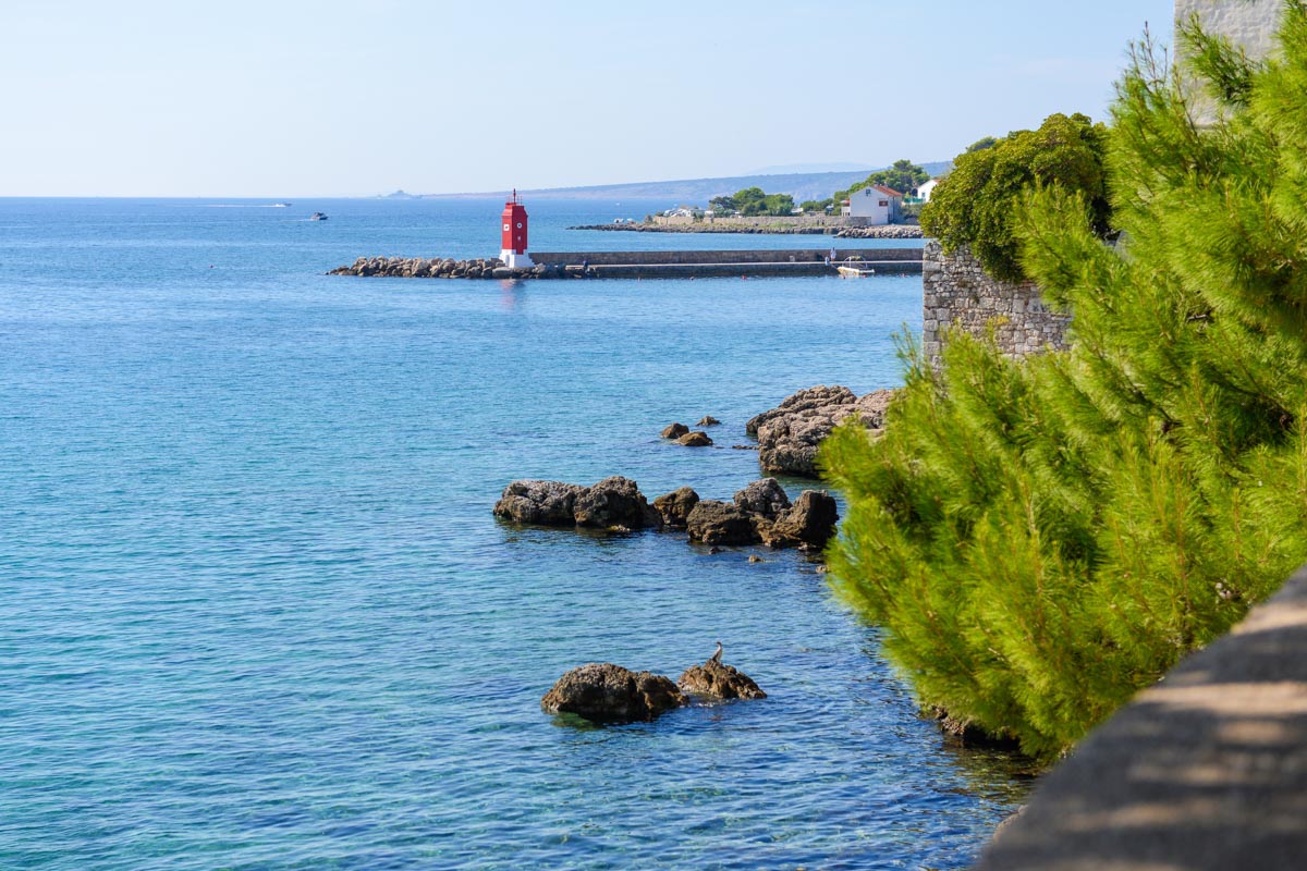 Ein kleiner Leuchtturm markiert die Einfahrt zum Hafen von Krk Stadt, Kroatien