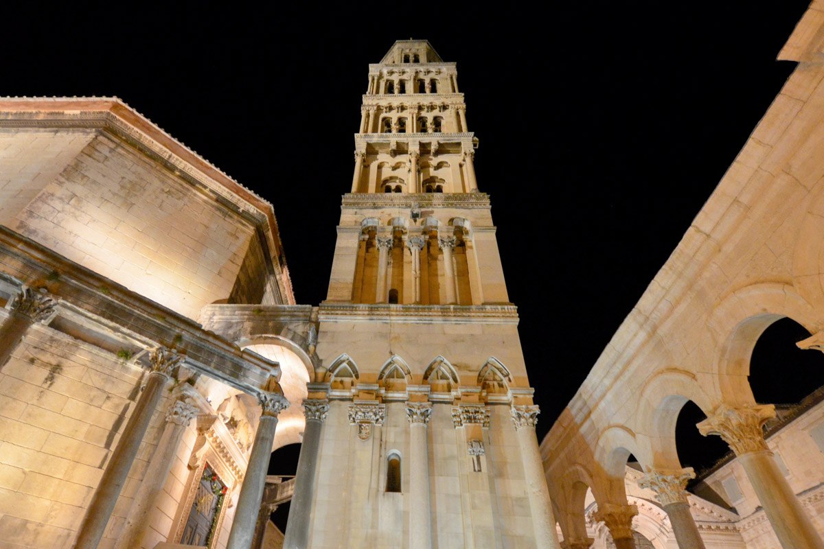Start Nächtlicher Blick auf den eindrucksvollen Glockenturm der berühmten Kathedrale Sveti Duje in der Altstadt von Split, Kroatien Nächtlicher Blick auf den eindrucksvollen Glockenturm der berühmten Kathedrale Sveti Duje in der Altstadt von Split, Kroatien