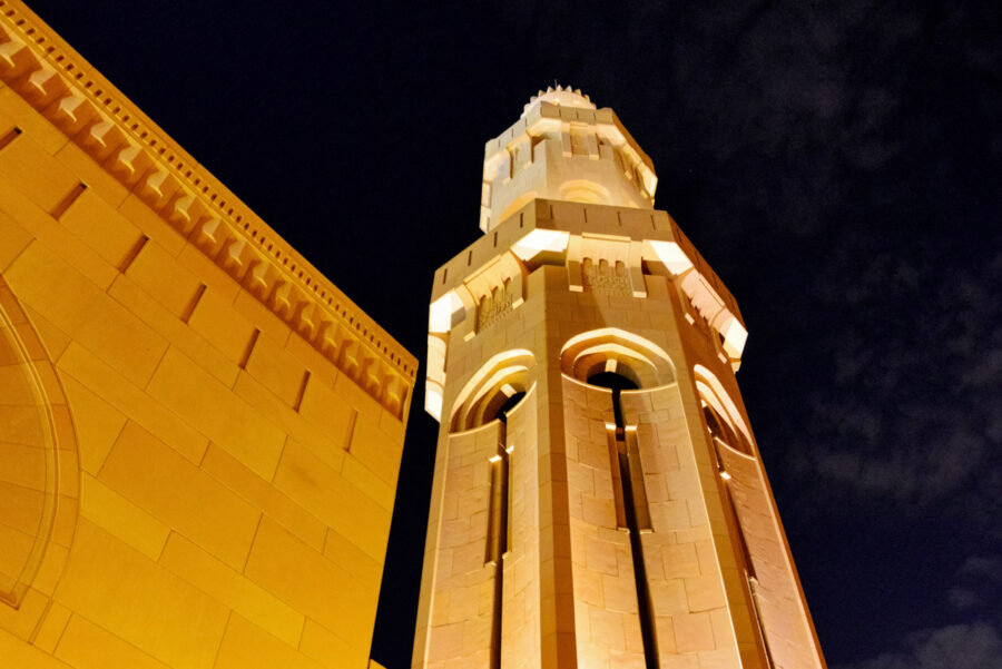 Wer sich der Sultan Qaboos Grand Mosque nähert, wird sofort von ihren monumentalen Ausmaßen und ihrer erhabenen Aura in den Bann gezogen. Das weithin sichtbare Hauptminarett der Moschee ragt fast 100 Meter in den Himmel. An den vier Ecken des weitläufigen Geländes erheben sich vier weitere, jeweils 45 Meter hohe Minarette – gemeinsam symbolisieren sie die fünf Säulen des Islam.